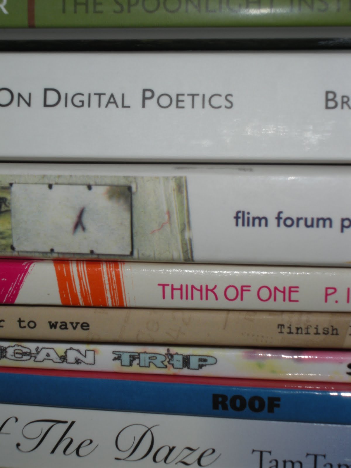“The Spoon——On Digital Poetics———-BR—————————–flim forum p—————————–think of one————————p.————————to wave————-Tinfish————————–can Trip—————————–ROOF———————————————The Daze—Tam”